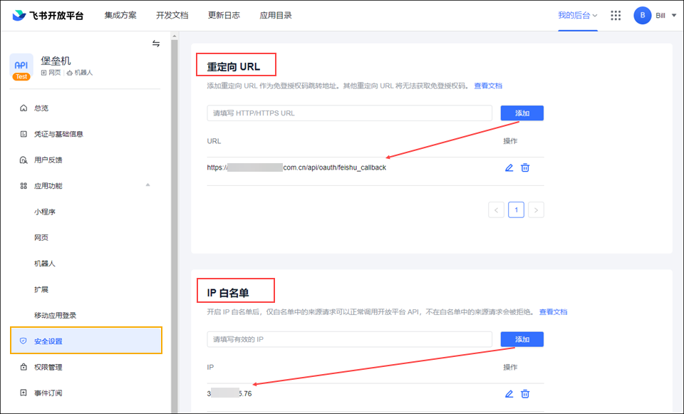 (8)进入“安全设置”页面中,添加“重定向 URL”以及“IP白名单”,记录下“重定向 URL”,这个是后面要填写到行云管家管理控制台的“RedirectUri”值;