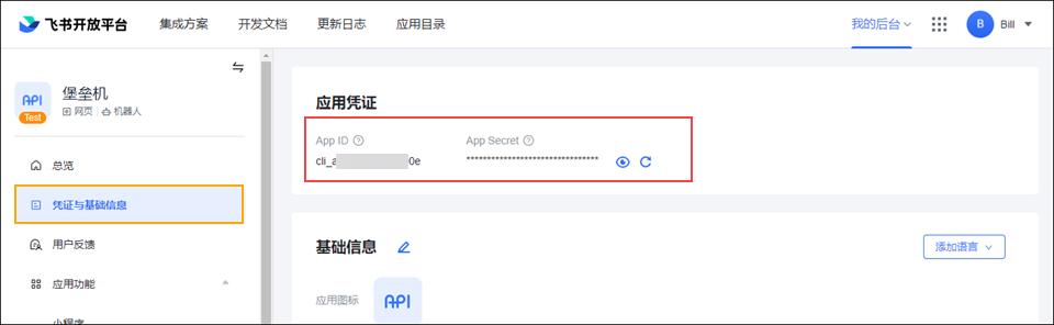 (9)进入“凭证与基础信息”页面中,记录下“AppId”、“AppSecret”;