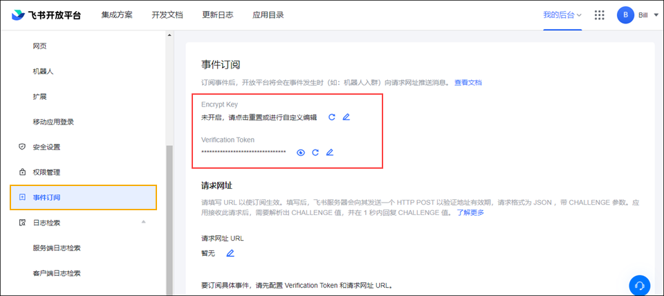 (10)进入“事件订阅”页面中,记录下“EncryptKey”、“Token”;