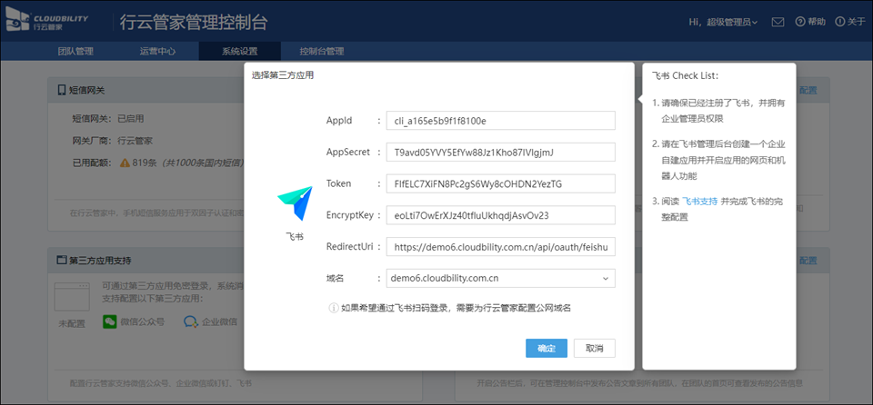 (5)最后,返回管理控制台“基本设置”->“第三方应用支持”->“配置飞书”里把“RedirectUri”、“域名”这两项里填写/选择为域名地址即可完成;