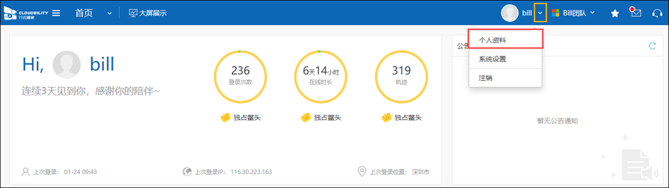 如图,登录行云管家点击右上角用户头像下的“个人资料”;