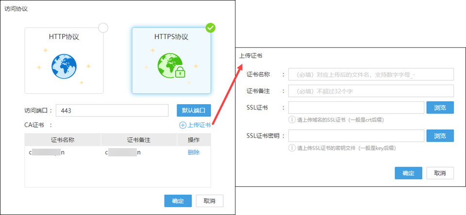 (2)请根据需要配置HTTP协议或HTTPS协议后点“确定”即可;