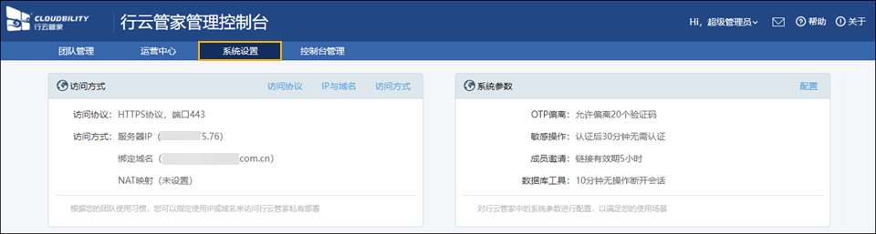 (1)请登录进入行云管家管理控制台,并点击“系统设置”菜单,进入“基本设置”页面,点击配置“访问协议”;