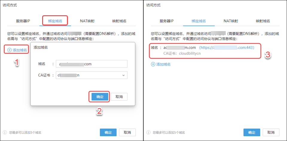 (4)输入域名,如果是HTTPS协议,请选择对应的CA证书,并点击“确认”;