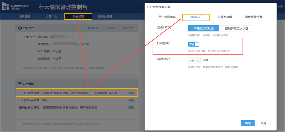 找到“身份认证”->“扫码登录”,进行“开启”,然后点击“确定”;
