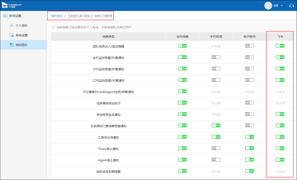 此时既可以在“消息订阅”界面来设置哪些消息通过“飞书”进行接收(如果没有在管理控制台配置飞书服务,那么在这里是无法设置飞书消息订阅的);