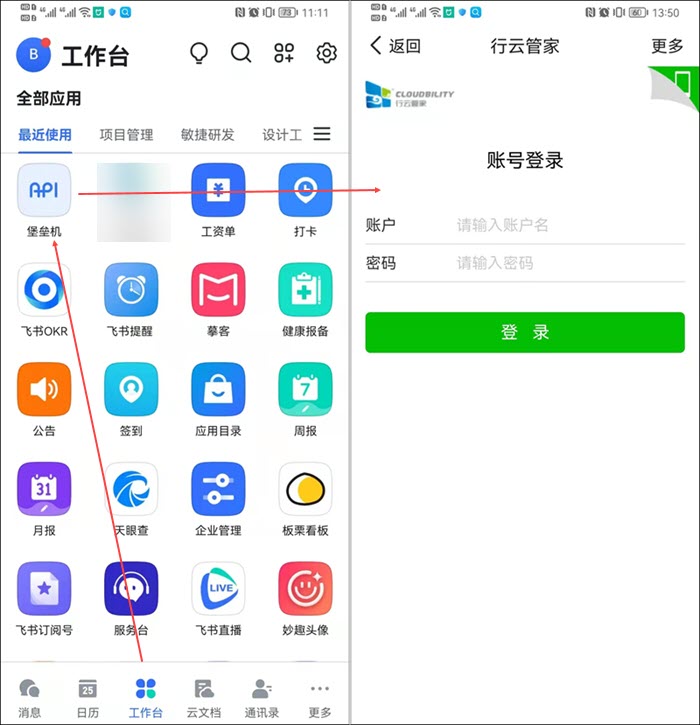 (2)Mobile版本支持:可通过“飞书APP”--“工作台”里的应用图标来访问手机版本的行云管家;