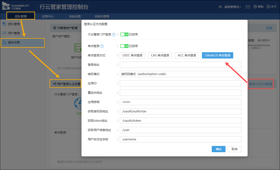 找到“团队管理”->“基础设置”->“用户登录认证设置”,点击“登录认证方式配置”,启用“单点登录”并选择“OAuth2.0单点登录”;