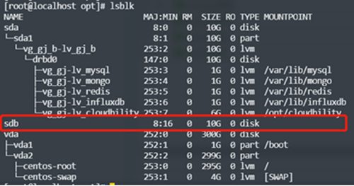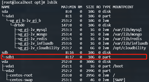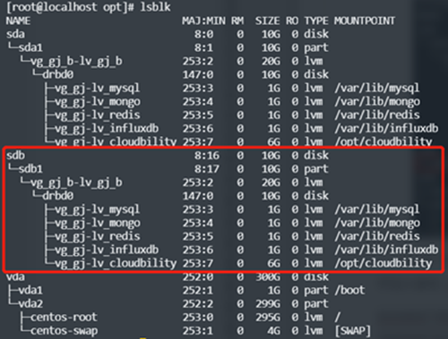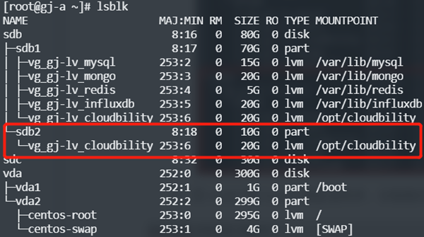 执行上述命令后,再执行 lsblk 命令,将看到类似如下输出,可以看到,sdb2 分区被加入到了vg_gj卷组中,并作为了逻辑卷lv_cloudbility的底层磁盘