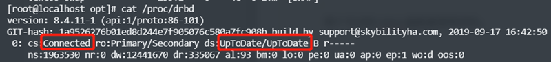 如上图,”Connected”表示两个drbd节点是处于连接状态的,”UpToDate/UpToDate”表明两个节点的drbd盘数据是同步的。