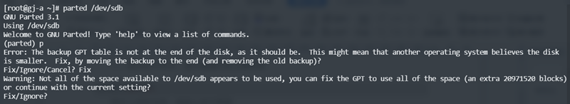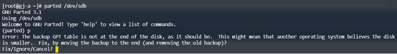 1.5、在上述界面中输入 q ,并敲回车键,完成分区表信息修正并退出parted工具界面