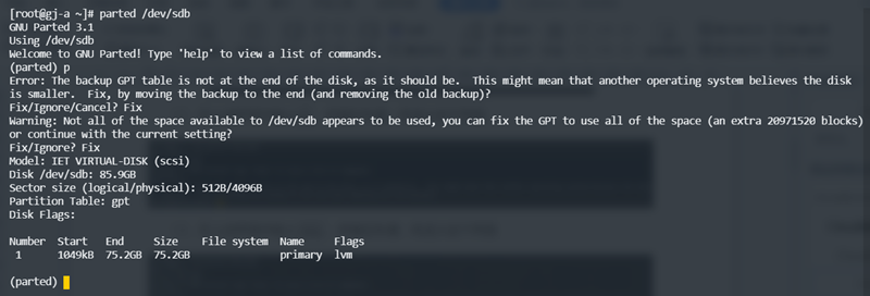 执行上述命令后,再执行 lsblk 命令,将看到类似如下输出,可以看到,sdb1 分区被加入到了vg_gj_b卷组中,并作为了逻辑卷lv_gj_b的底层磁盘