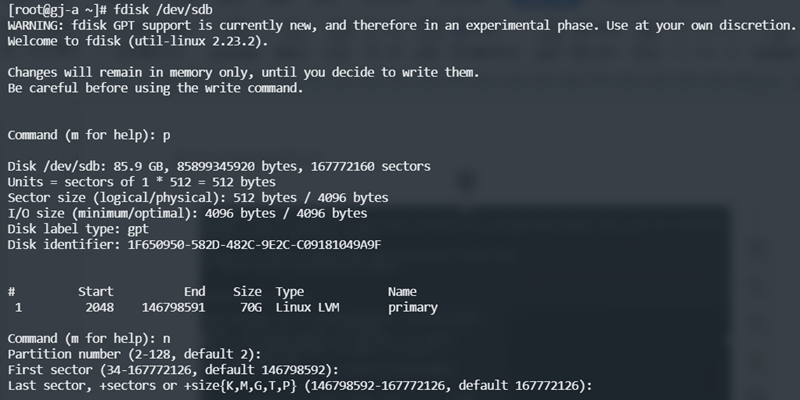 2.3、在上述界面中,输入 n ,敲回车键,进入如下界面,准备创建新的分区
