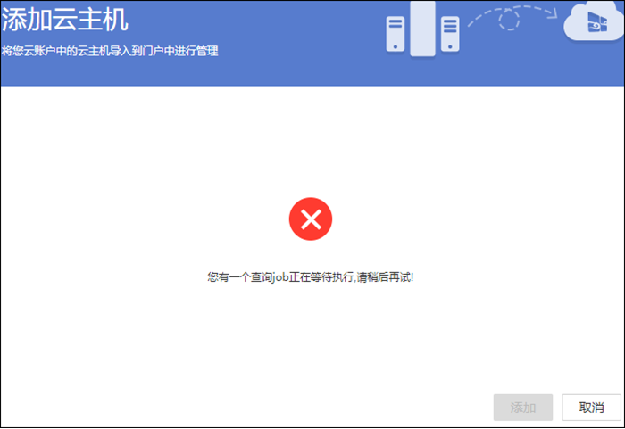 这是由于您之前导入公有云的查询过程中点击了取消,此时去导入其他公有云主机时就会出现这个提示,需要您等待原来的查询完结后才可以进行公有云主机添加;