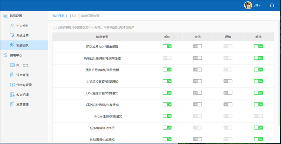 请点击您“头像”下的“个人资料”,然后在“账号设置”点击“我的团队”,在您的团队里点击消息订阅;