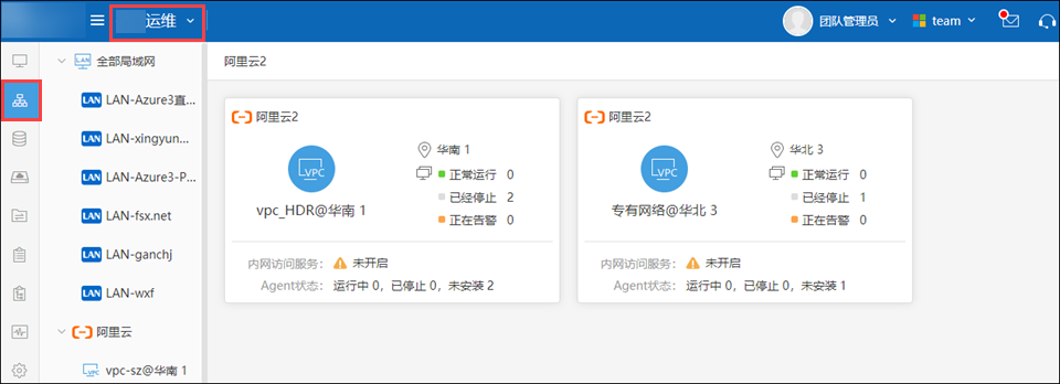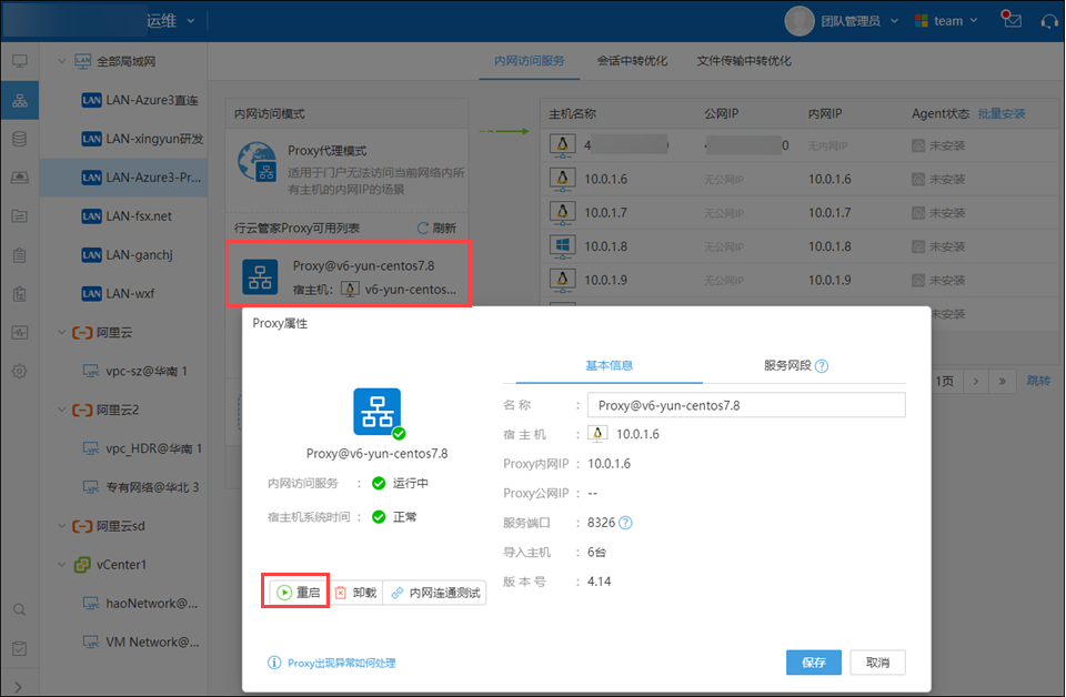 点击“资源运维”的“网络管理”菜单下的该云账户或VPC,如图进行Proxy重启(前提是网络处于连通状态);