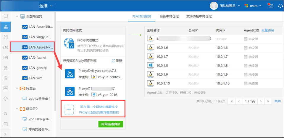 (1)Proxy安装成功后,将会在“资源运维”的“网络管理”菜单下的该云账户或VPC下自动出现新增的Proxy,可以通过刷新浏览器来查看当前Proxy最新状态,此时,还可以通过点击如图“可在同一个网络中部署多个Proxy以起到负载均衡的目的”来安装多个Proxy(推荐!);