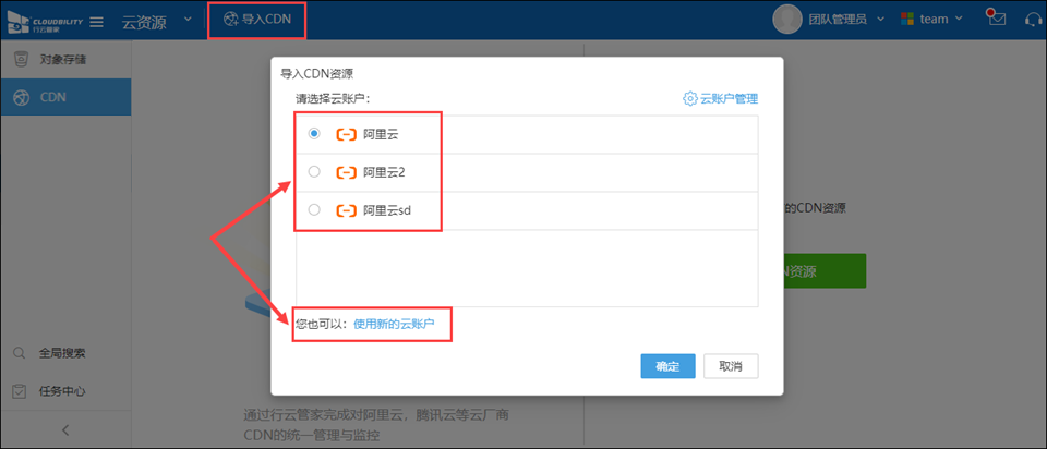 CDN是行云管家支持的一种重要云资源,首先请将菜单切换至“云管平台”菜单下的“CDN”栏目,目前支持导入阿里云以及腾讯云CDN。