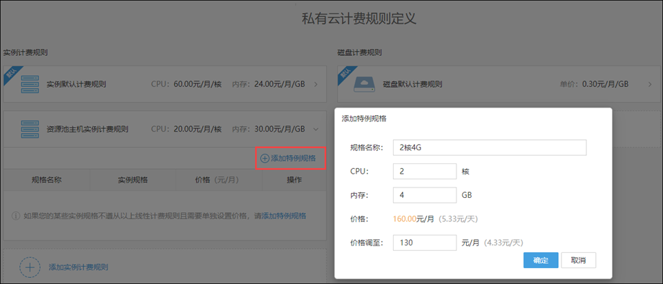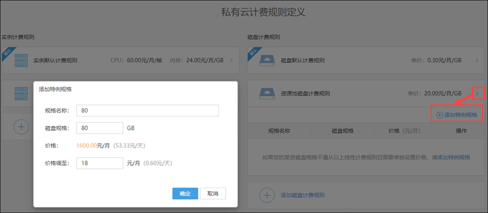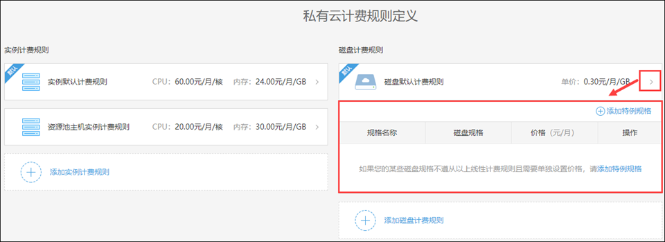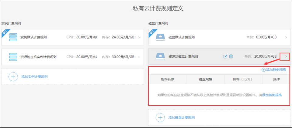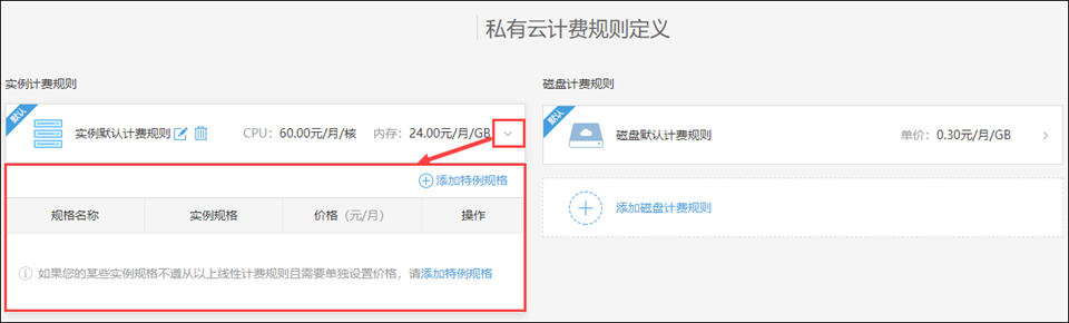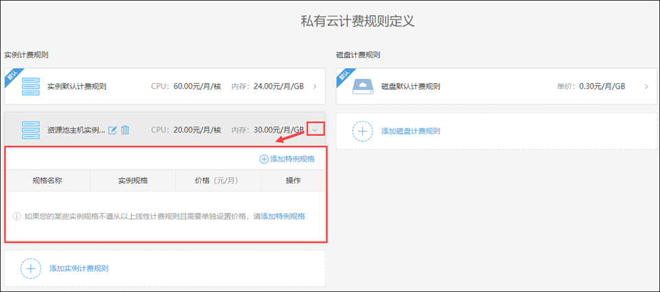 展开规则,可以向规则中添加特例规格,从而为某些不遵从线性计费规则的实例进行单独单独设置价格