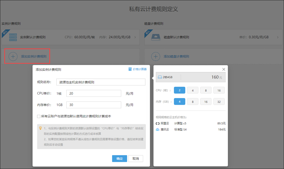 点击“添加实例计费规则”,弹出添加实例计费规则对话框,设置您的实例计费规则,在设置时,可以使用价格计算器提供价格参考,辅助您进行价格设置,设置完成后,点击“确定”完成规则添加