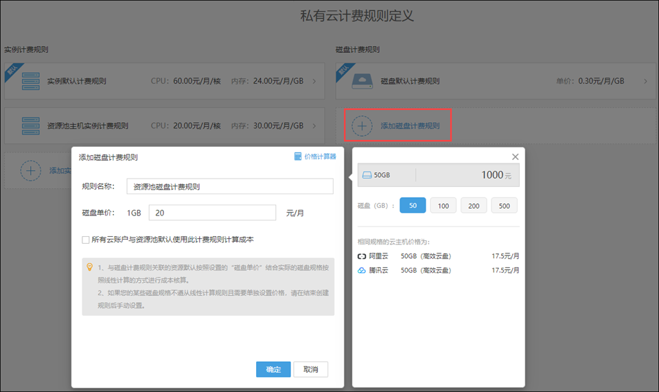 点击“添加磁盘计费规则”,弹出添加磁盘计费规则对话框,设置您的磁盘计费规则,在设置时,可以使用价格计算器提供价格参考,辅助您进行价格设置,设置完成后,点击“确定”完成规则添加