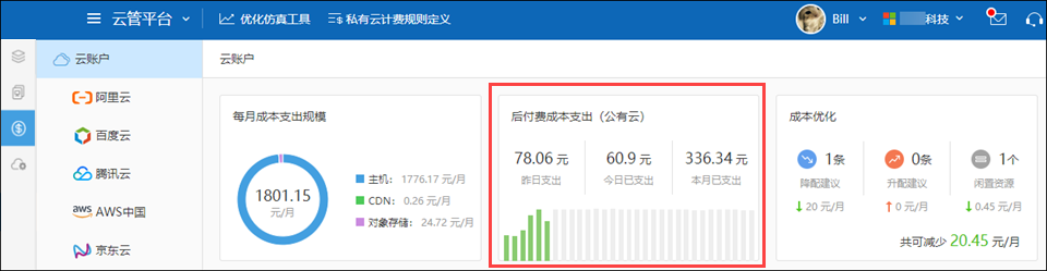 在“云管平台”菜单下进入“成本中心”栏目,在整个成本总览中提供了“后付费成本支出”,用户可以在此查看昨日、今日以及本月的已支出情况;