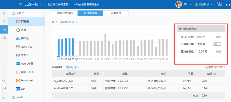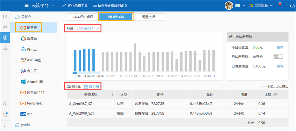 在每个云账户里,可以看到“后付费详情”,支持按月查看以及查看某天的明细,并根据过往的消费情况提供当月的消费支出预测;