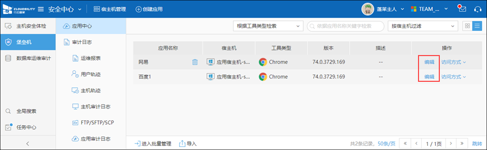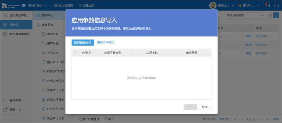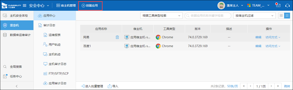 (1)进入“安全中心”->“堡垒机”->“应用中心”菜单页面,点击“创建应用”,将弹出创建应用对话框;