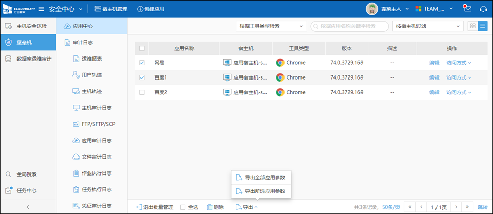 如图进入批量管理后,选择应用并点击导出,可以导出相关应用已填写的应用参数;