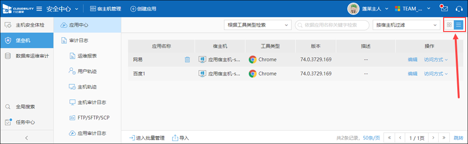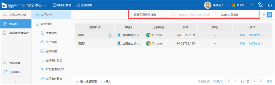 如图,可以根据工具类型进行筛选,根据应用名称关键字进行检索,根据宿主机进行过滤;