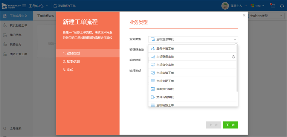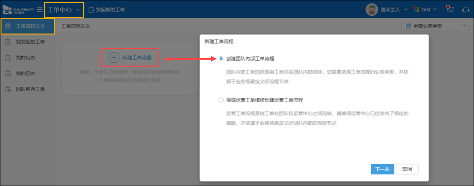 (1)首先进入到“工单中心”->“工单流程定义”->“新建工单流程”,点击“创建团队内部工单流程”;