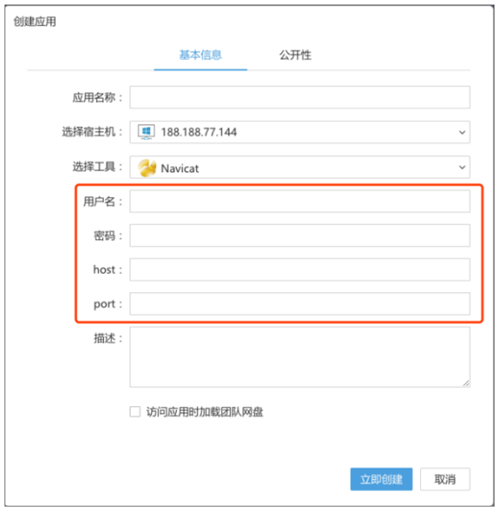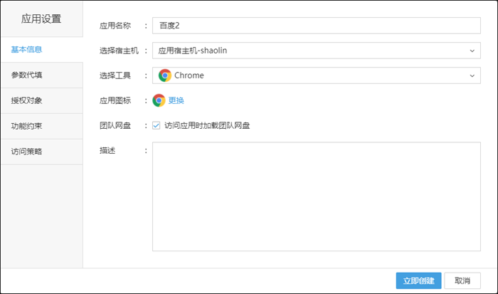 (2)“基本信息”:我们这里以通过发布的工具“谷歌浏览器”为例来创建一个应用“百度网”为例。填写要发布的应用的“应用名称”、选择这个应用要通过哪台应用宿主机来访问、选择该应用宿主机中已发布的“工具”、选择应用的“图标”、选择访问应用时是否加载“团队网盘”(访问应用过程中,可以通过团队网盘来进行文件传输);