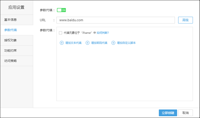 (3)“参数代填”:因为我们以创建“百度网”为例,所以这里请填下网站的URL,例如www.baidu.com。
