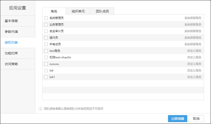 (5)“授权对象”:在这里我们选择应用要授权的角色、部门以及用户;