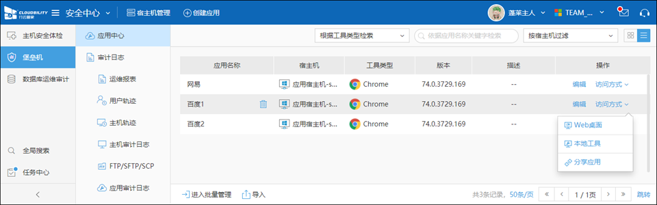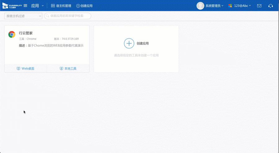 安装好应用宿主机,并且在“宿主机管理”里添加宿主机并发布了应用工具后,就可以正式在应用中心里创建、管理和访问应用了;