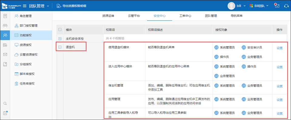依次点击“团队管理”、“权限管理”、“功能授权”、“安全中心”、“堡垒机”;