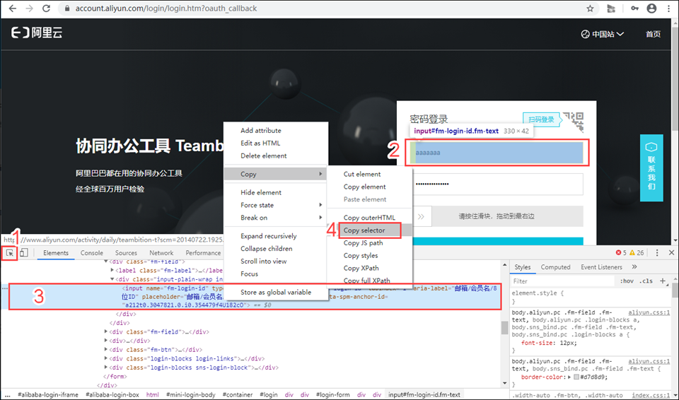 (3)如图,在“开发者工具”里点击最左边的“鼠标箭头图标”,然后把您自己的鼠标移动到填写账号的框那里,此时“开发者工具”的“Elements”会对应标蓝色,在这里右键鼠标,然后选择“Copy”,选择“Copy selector”,然后请回到行云管家网页里粘贴到“代填节点”里;