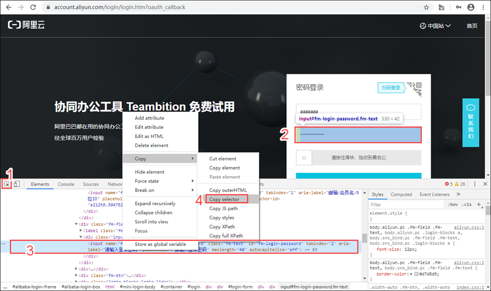 (3)如图,在“开发者工具”里点击最左边的“鼠标箭头图标”,然后把您自己的鼠标移动到填写密码的框那里,此时“开发者工具”的“Elements”会对应标蓝色,在这里右键鼠标,然后选择“Copy”,选择“Copy selector”,然后请回到行云管家网页里粘贴到“代填节点”里;