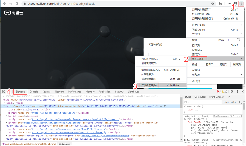 (2)另外打开一个网页,并打开阿里云登录网址,然后按如图步骤在当前网页打开“开发者工具”,并选择“Elements”;