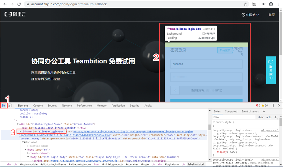 (1)打开刚才阿里云登录网址,和上述步骤一样同样打开当前网页的“开发者工具”,并选择“Elements”;