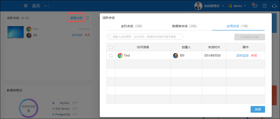 点击“首页”菜单,管理员可以查看当前在连应用的活跃会话,并且如果发现用户有不安全操作,可以强制关闭该会话;