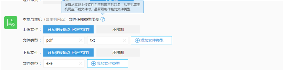 设置从本地上传至主机或主机网盘、从主机或主机网盘下载文件时,是否限制传输的文件类型;