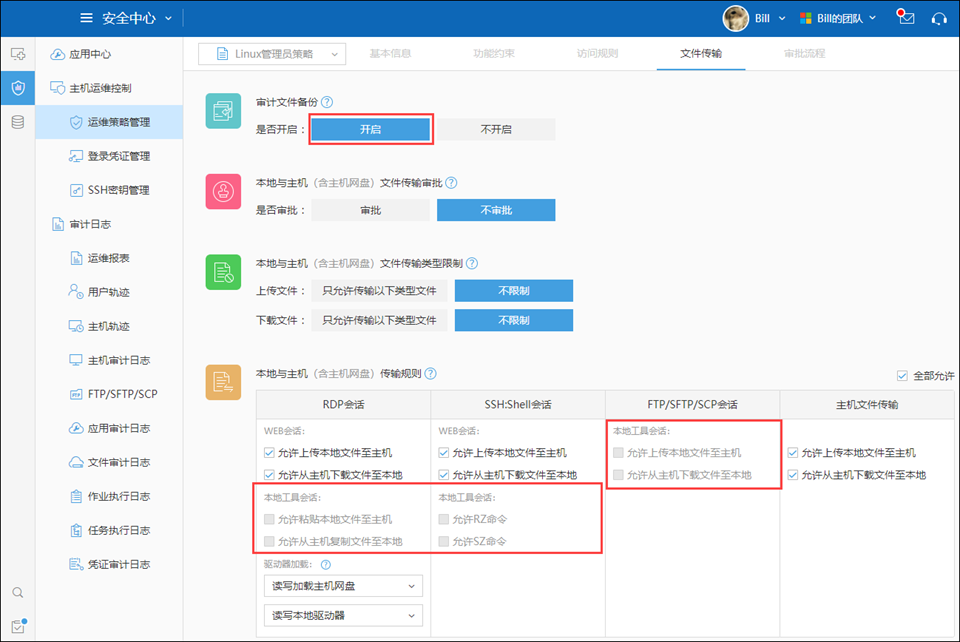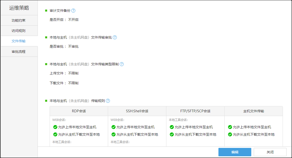 参考创建主机运维策略后即可进行文件传输设置,在“文件传输”里,可以对“审计文件备份”、“本地与主机(含主机网盘)文件传输审批”、“本地与主机(含主机网盘)文件传输类型限制”、“本地与主机(含主机网盘)传输规则”、“主机(含主机网盘)与团队网盘/其他主机(含主机网盘)传输规则”做相关设置;