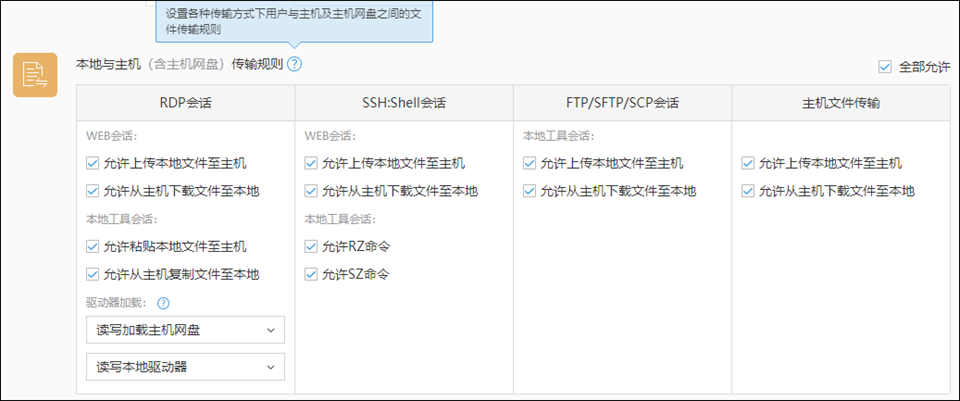对RDP和SSH的WEB会话限制是否允许上传本地文件至主机、从主机下载文件至本地;
