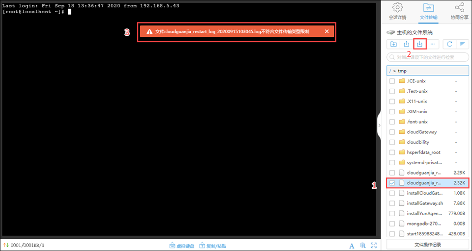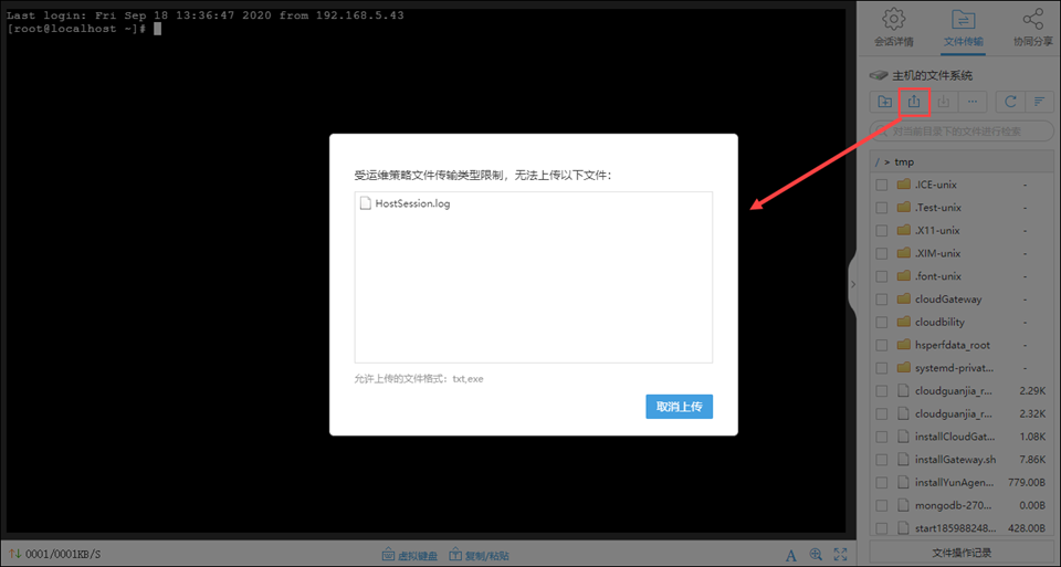 (1)限制上传类型后,远程会话上传本地文件或本地目录: