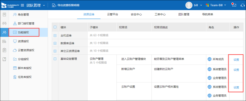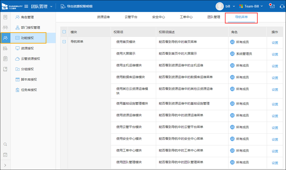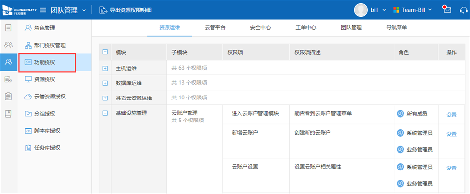 进入“团队管理/权限管理”,点击“功能授权”页签。在这里列出了行云管家全部功能权限项,您可以通过设置操作对角色、部门或成员进行功能授权。