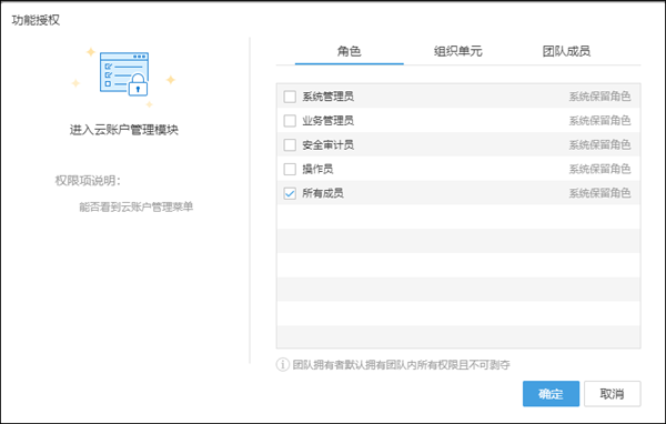这里可以看到,可以授权的授权对象为角色、组织单元(部门)、团队成员。需要注意的是,如果您勾选了“所有成员”,那么整个团队里的所有成员都将会有该权限。