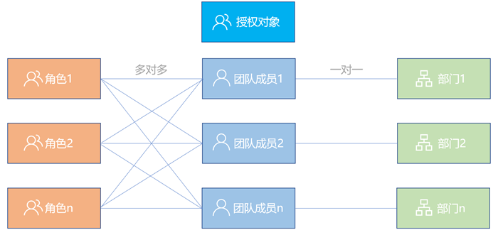 除了可以授权给团队成员,在基于角色、部门的访问控制模型中,我们还可以把功能权限赋予角色或部门,再把该成员加入到相关角色或部门里。以角色为例,团队成员和角色,角色和功能权限都是多对多的关系。团队成员拥有的功能权限等于该成员所在的角色持有功能权限之和。