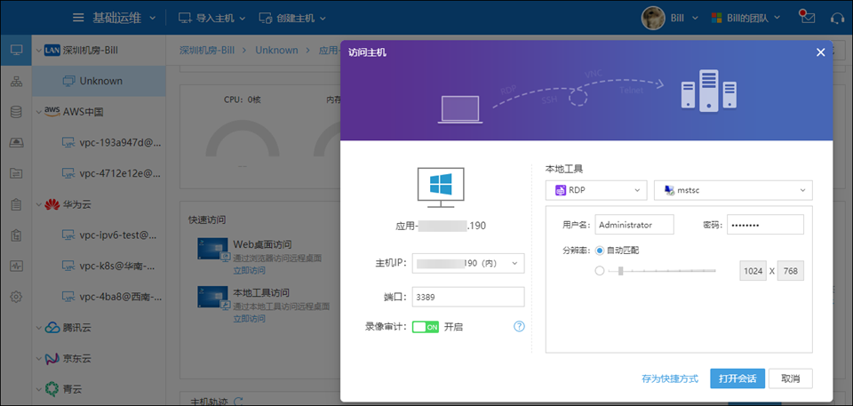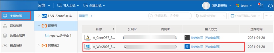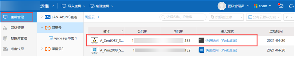 (1)在“资源运维”下的“主机管理”里找到需要进行文件传输的主机。为了获得最流畅的文件传输效果,建议以内网IP访问形式创建会话。