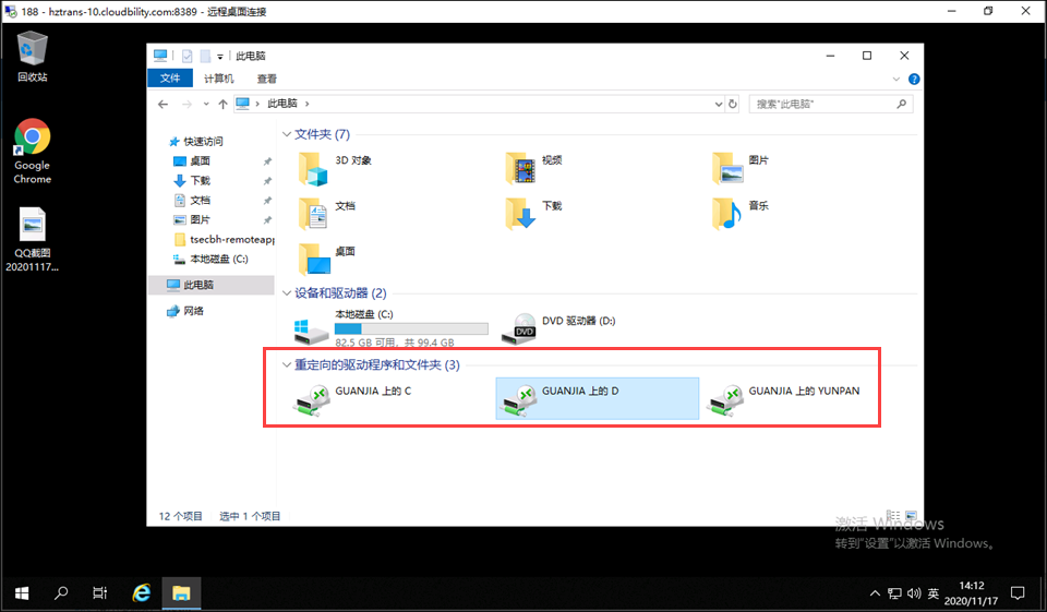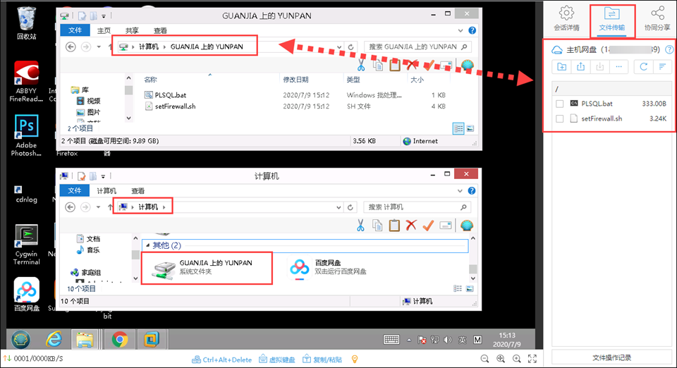 例如,在右边栏“文件传输”里上传一个文件,那么将会如图先传输到“计算机”里的“GUANJIA上的YUNPAN”这个主机网盘里,然后用户只需要在这个网盘里再讲文件传输到目标主机/服务器的其他盘符或桌面即可。